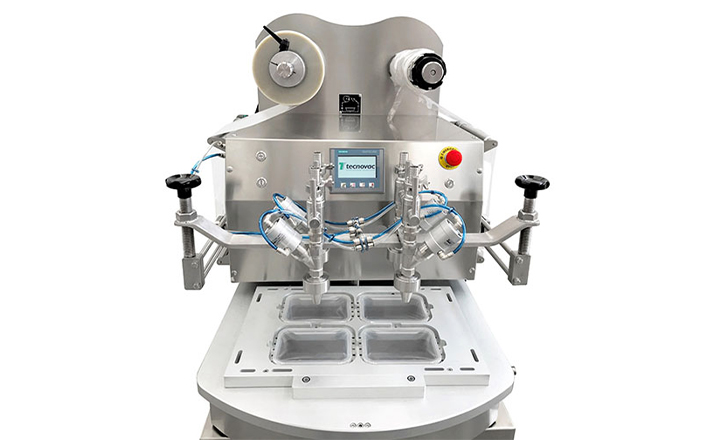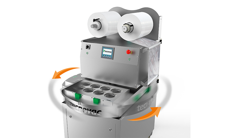 ロータリー式トレーシーラーのオリンピア・プロ型はチャンバー内の製品が脱気されている間に、次のトレーを手前の金型にセット出来る為、効率的な生産が可能な機種となっております。